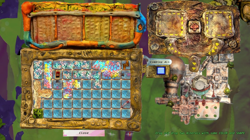 Okay, I have expended all the words I wish to regarding mechanics, because the real draw of Mashina lies in its aesthetics. Almost every graphical element is comprised of real-world objects and crafts. All the characters are hand-fashioned, stop-motion dolls, and their various paraphernalia made from the sort of odds and ends that turn up and live forever in junk drawers. As such, one of the undimming joys of this title is seeing new characters, drills, trinkets, and other props, and what they’re crafted from.